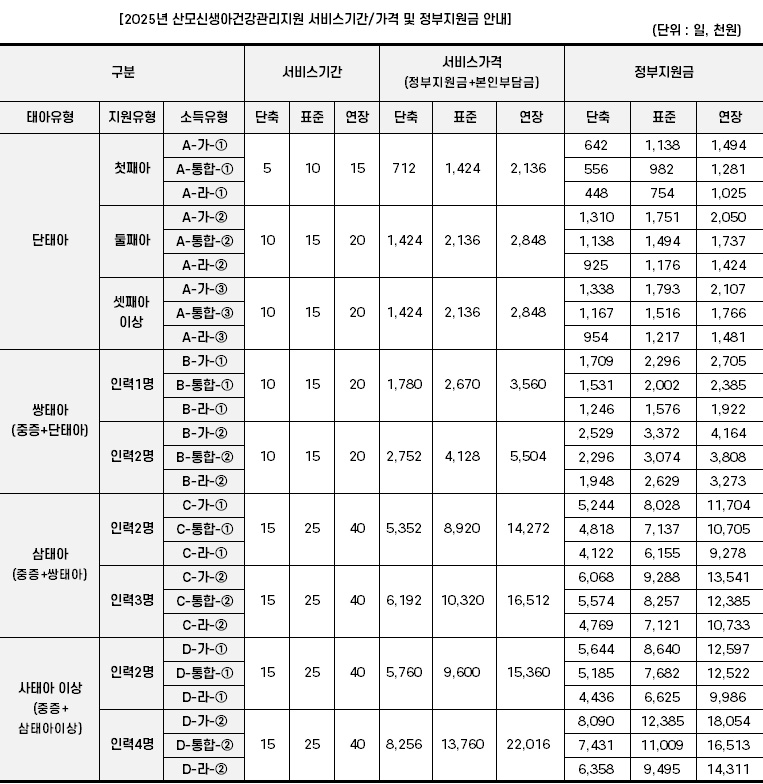 산모신생아 건강관리사 지원 서비스의 서비스 가격, 정부지원금, 본인부담금은 지원유형과 소득유형에 따라 달라집니다. 상세한 지원유형, 소득유형은 서비스 신청 시에 확인이 가능합니다. 아래 표를 통하여 서비스 기간에 대한 서비스 가격 및 정부지원금을 확인할 수 있습니다. 서비스가격에서 정부지원금을 제외하면 본인 부담금을 알 수 있어요.